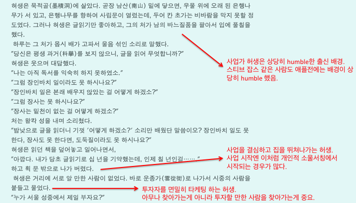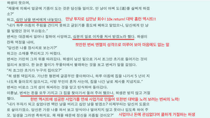 근데 차근차근 읽다보니 고등학교 때와는 사뭇 다른 눈으로 보게 되었다. 예전에 배우기론 형식과 겉치레에 물든 조선 사대부를 풍자하는 문학작품이라고 들은것 같은데, 이건 내가 지금 보기에 완전한 ‘벤처’ 소설이다. 허생이란 선비가 사업가로 뛰어들게 된 과정, 펀드레이징, 사업전략과 그 전개 과정, 글로벌 진출, 엑시트및 투자자금 회수까지의 과정이 상세히 담겨 있다. 벤처라는 말이 생기기도 수백년 전에 연암 박지원은 벤처를 이해하고 있었다. 엄청난 혜안이 아닌가!